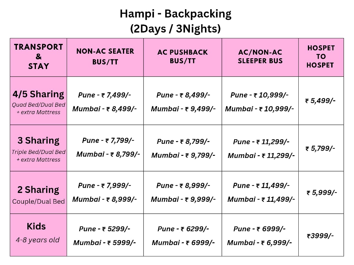 - Additionals : Camera, Torch, Sunglasses, Sanitizer, Daily essentials, Facewash, Sunscreen, moisturizer, extra bag for wet clothes, Personal medicines (if any)